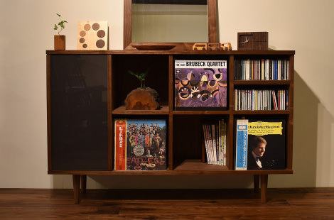 レコードがぴったりと納まり、ディスプレイもできるLPラックです。500枚以上のLPやCDが入り、小物が収納できるガラス扉も設けています。機能的かつシンプルで軽やかなデザインです。