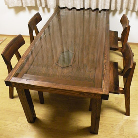 旧家の梁、扉を再利用した松のダイニングテーブルセット