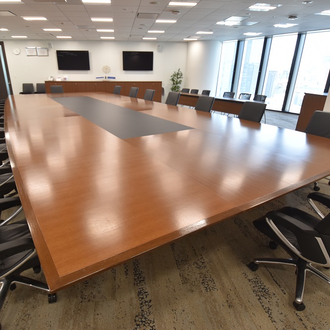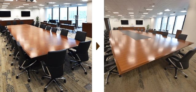 COVID-19(新型コロナウィルス感染症)対策として、ソーシャルディスタンスを保つためのリサイズ。「広い会議室いっぱいにテーブルも大きくしたい」と依頼をいただきました。様々なデザインをご提案した上で、中央に本革調のメラミン合板を足す案を採用いただきました。脚となる台も含め大改造。もともと大きな会議室テーブルを、長さ約2m、奥行き1.2mサイズアップ。結果的に8.9m×3.7mの巨大な会議室テーブルとなりました。