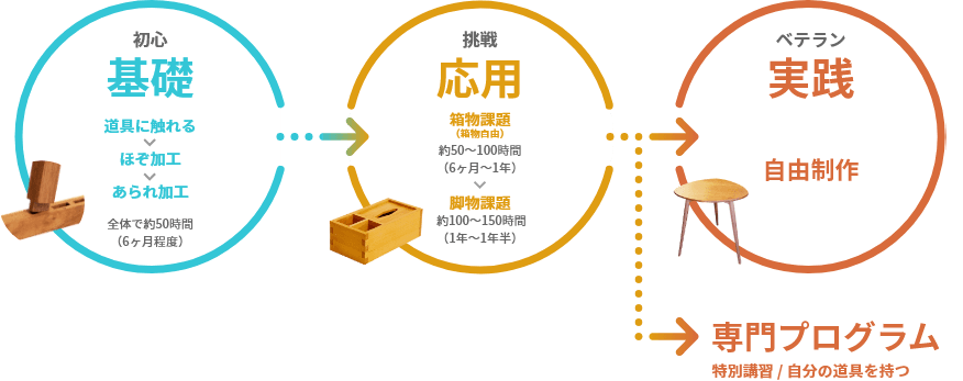 木工を楽しむための土台となる、基礎的な知識や技術を学びます。全くの初心者でも無理なく安心して学べるよう、カリキュラムを整えています。