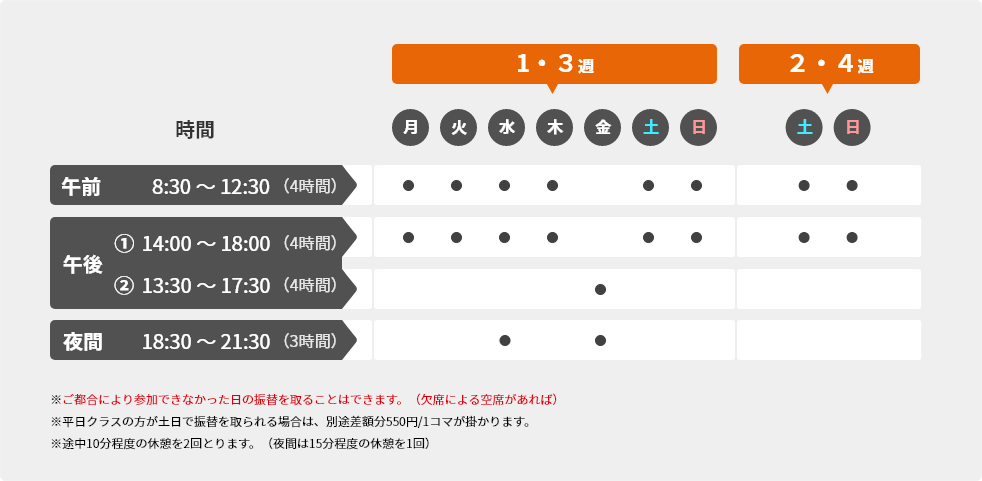 1クラスで月2回(隔週)の受講となります。土日のみ【第1・3週】か【第2・4週】のどちらかをお選びください。