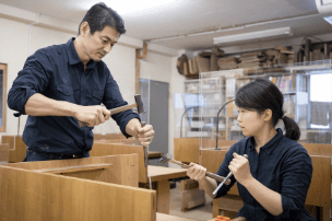 一級家具製作技能士の国家資格を持つ職人が、デザイン・設計・加工・塗装など、幅広い知識・技術を丁寧に教えています。