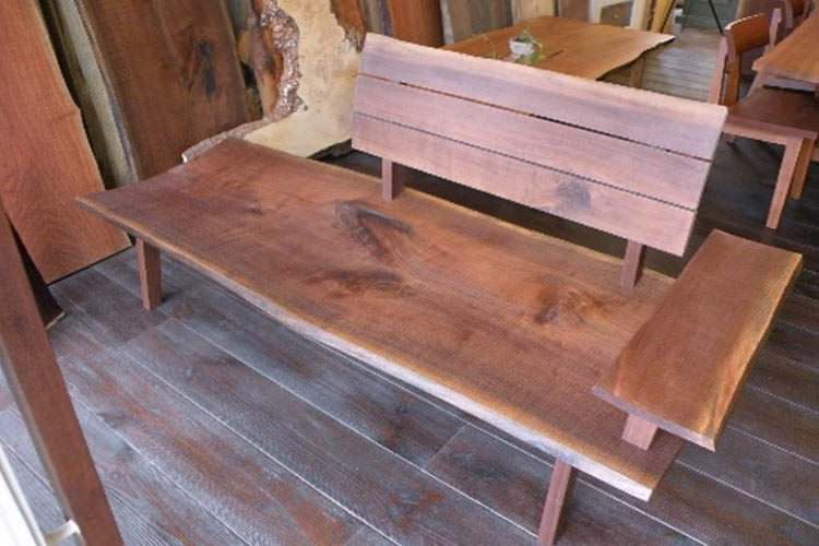 ブラックウォールナットの大きな一枚板座を使用した贅沢なソファーです。この座面や背もたれの曲線、実は製材時に偶然反ってしまった曲線をそのまま活用しています。そのため、表面は大鋸目(おがめ)という鋸の跡があり、とても良い質感となっています。