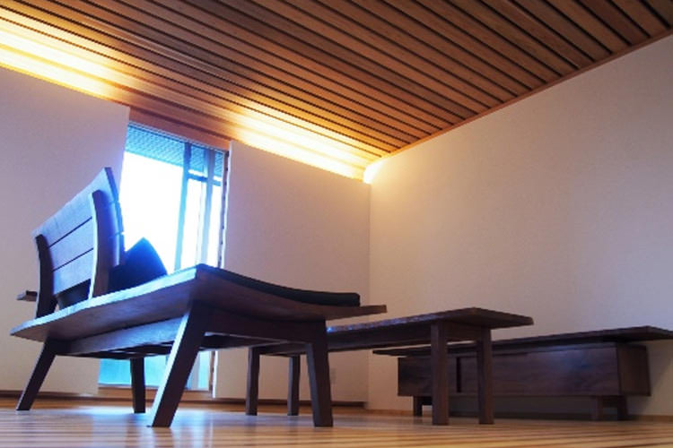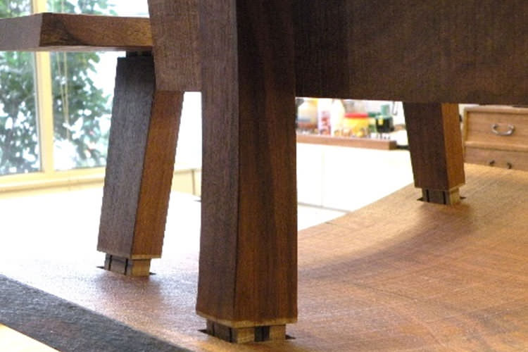 シンプルなデザインですが、身体を支える背もたれを接合する仕口は「通し2枚ほぞ、2段ほぞの裏くさび」です。家具の仕口の中でも最も強固な仕口の一つを使用しています。自然のいたずらを美しく活かすため、高い技術で作り上げた逸品でした。