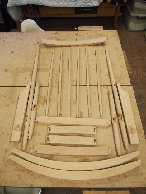 このロッキングチェアーはパーツ数がとても多い椅子になります。全てのパーツを正確に加工し終えるまで、数週間に渡り緻密な加工が続きます。ほとんどのパーツは妥協のないホゾ組みで接合させます。人が座り、揺れが発生するロッキングチェアーは、椅子の中でもトップクラスの強度が必要なため、正しい仕口で、高い加工精度で組み上げることが求められます。