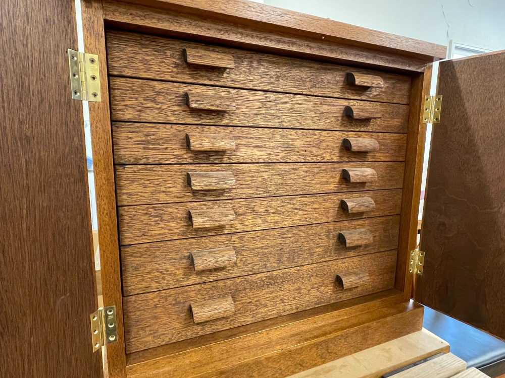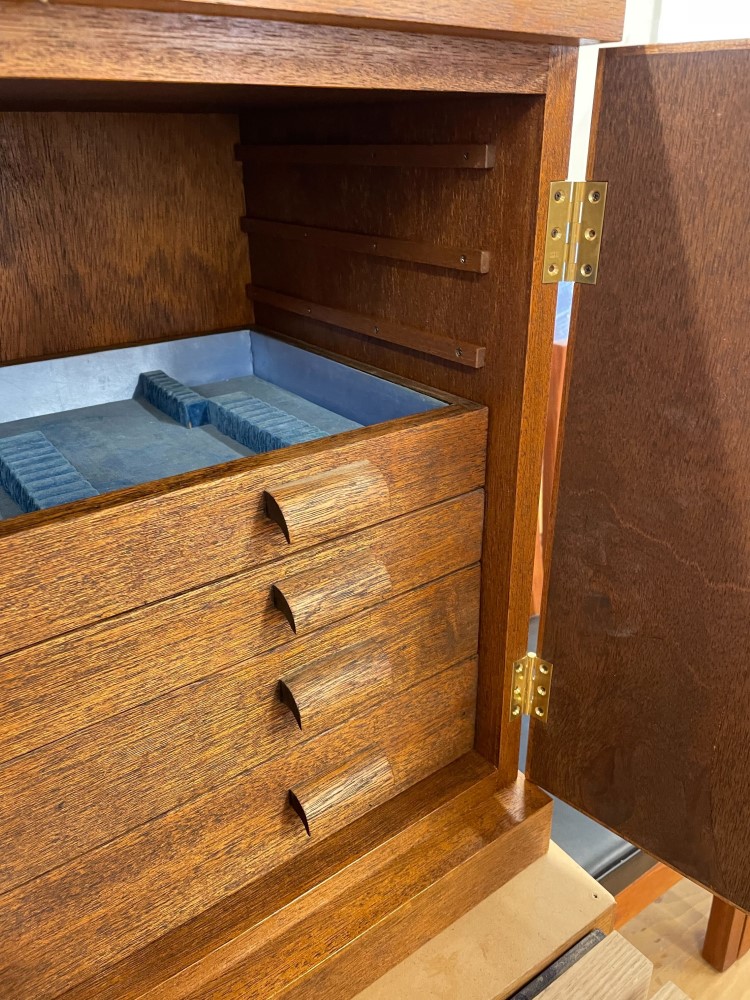 扉の丁番は真鍮の削り出しで作られた物を使用し、箱の内部側面には引き出しに合わせた吊り桟を取り付けました。