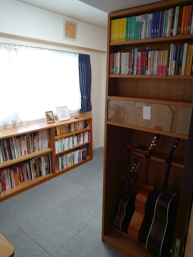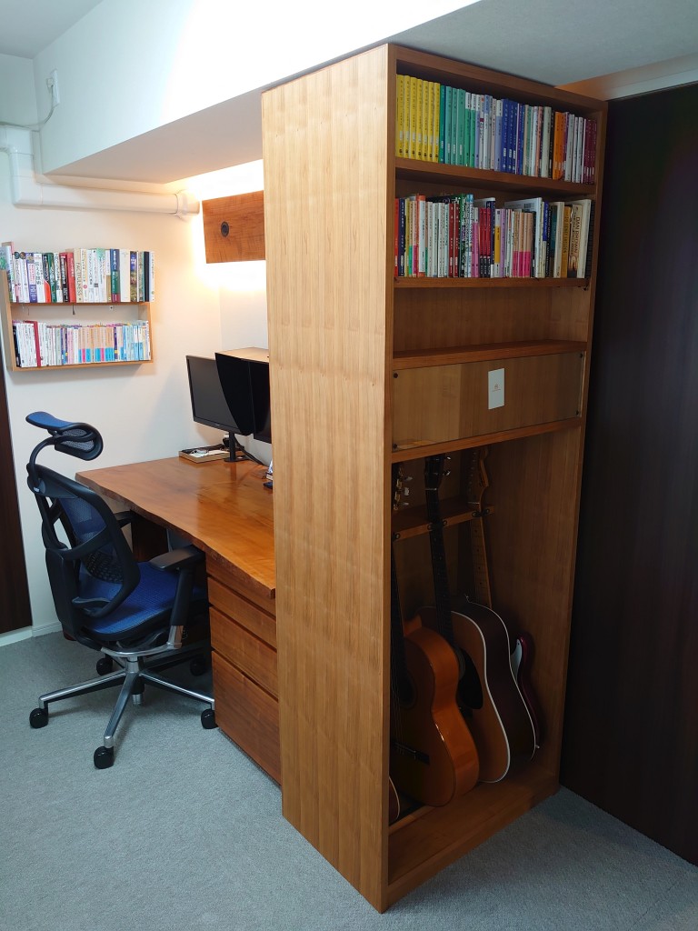 ご希望は、天井までの高さで、両面使いで、ギターが収納出来て、デスクと同じサクラ材で、というものでした。