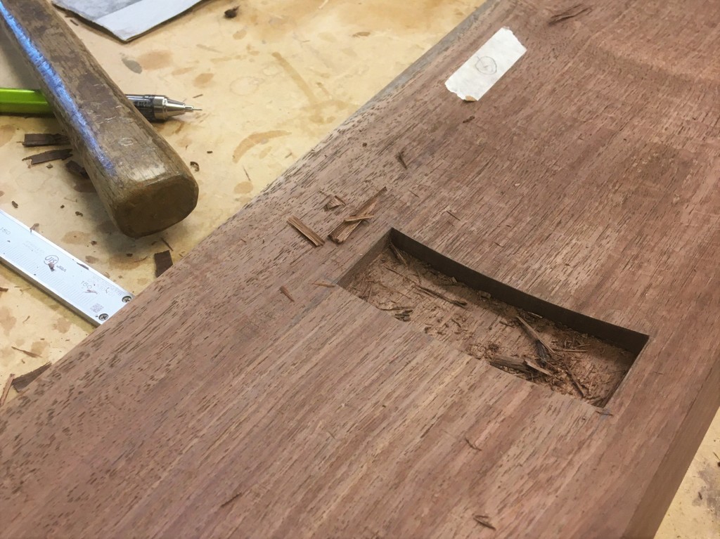 背もたれの裏側に掘り込みをし、脚と繋げます。