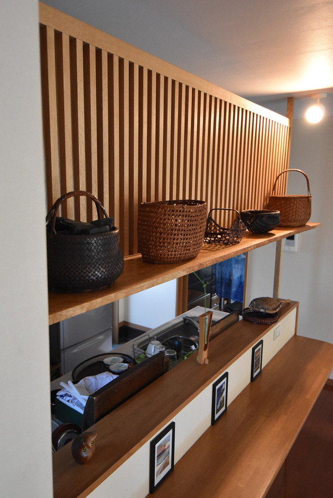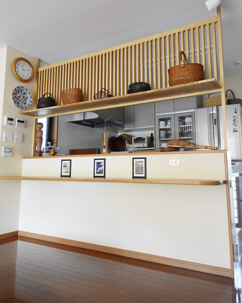 既存のキッチンカウンターに棚付きの格子を制作しました。