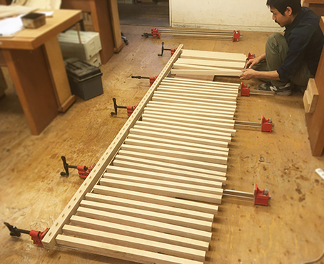 格子の間隔が一定になるよう縦格子、枠材を丁寧に加工しました。縦格子は全体で見たときに、より自然に見えるよう色味や木目、順目と逆目の向きを考慮して並べています。