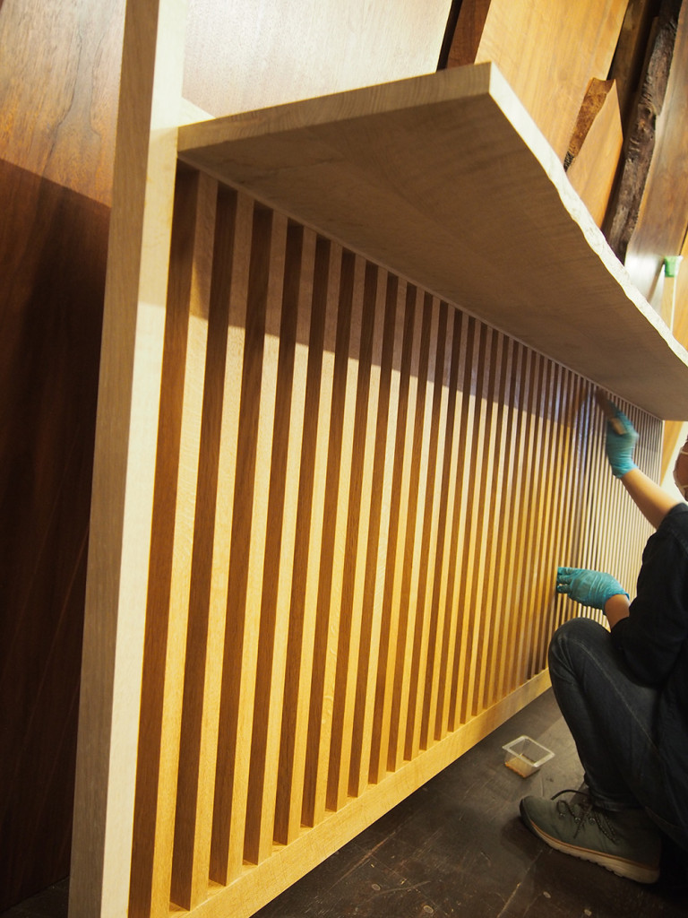 棚板はブックマッチではぎ合わせた板材を格子枠に取付けました。棚板の片側は、整えきらずに、木の形状を活かしたかたちにしています。格子が整然としているため、この棚板があることで、より柔らかな印象になりました。