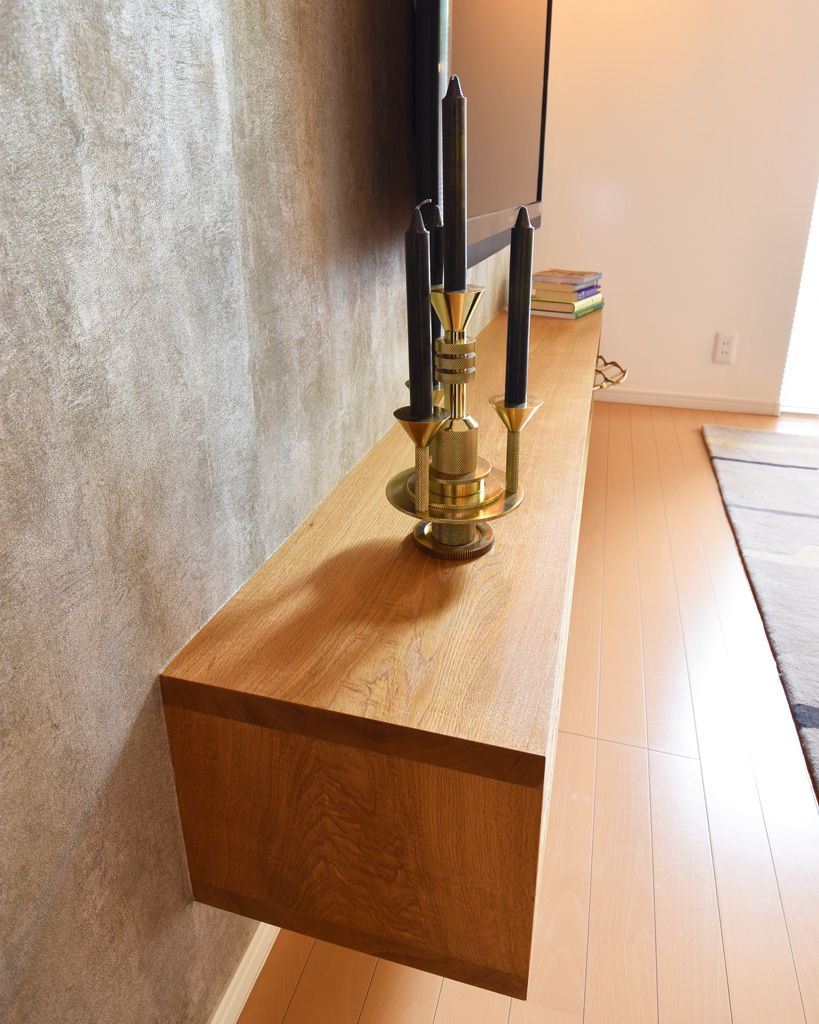 シンプルになればなるほど素材が重要になってきます。美しいナラの1枚板を使用したTVボード。単なる四角い枠だからこそ美しい無垢の1枚板で作ると、とても良い仕上がりになります。