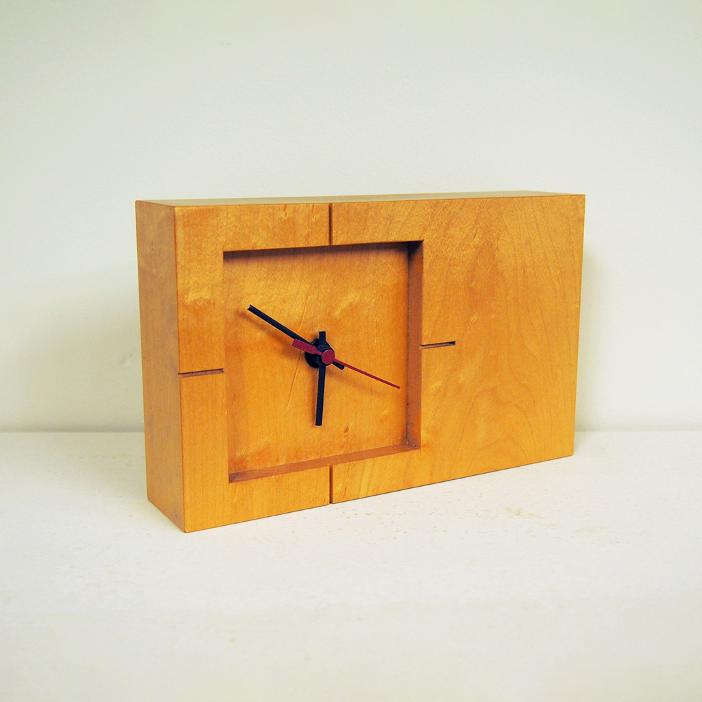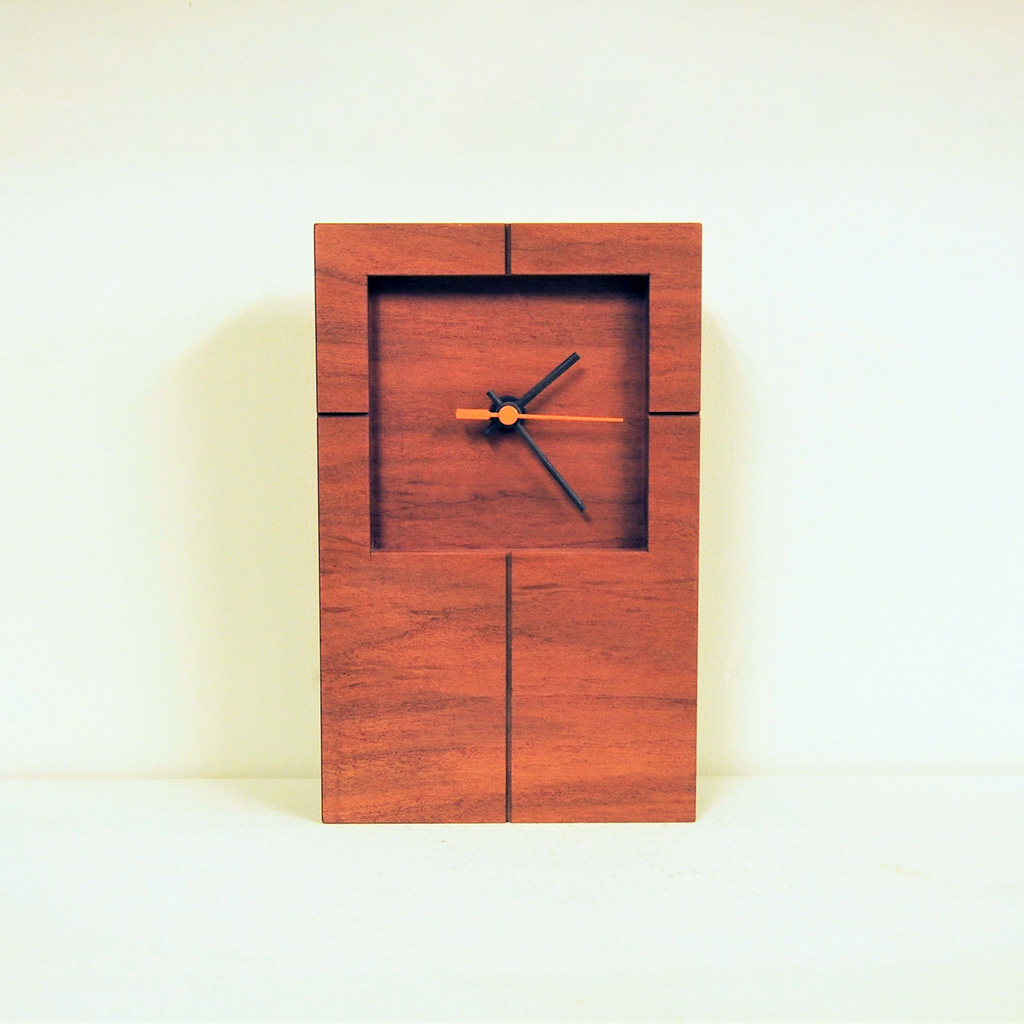 木の表情が豊かな様々な樹種の厚板を使った、シンプルなデザインの置き時計です。