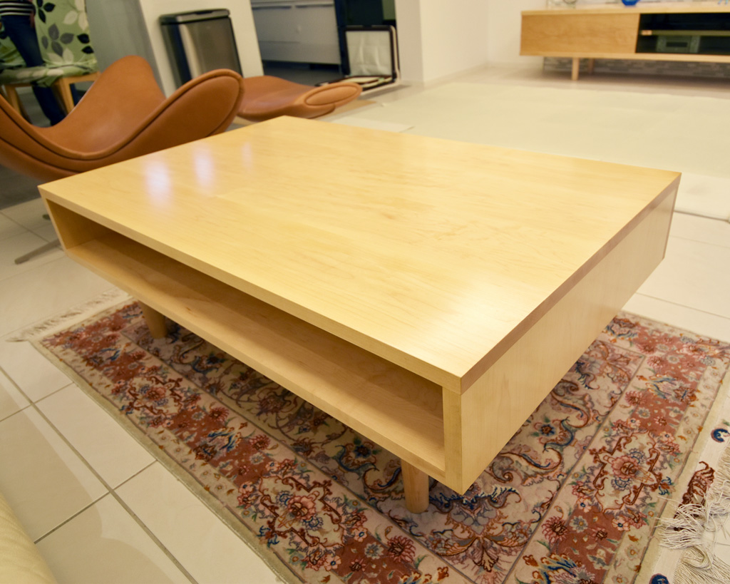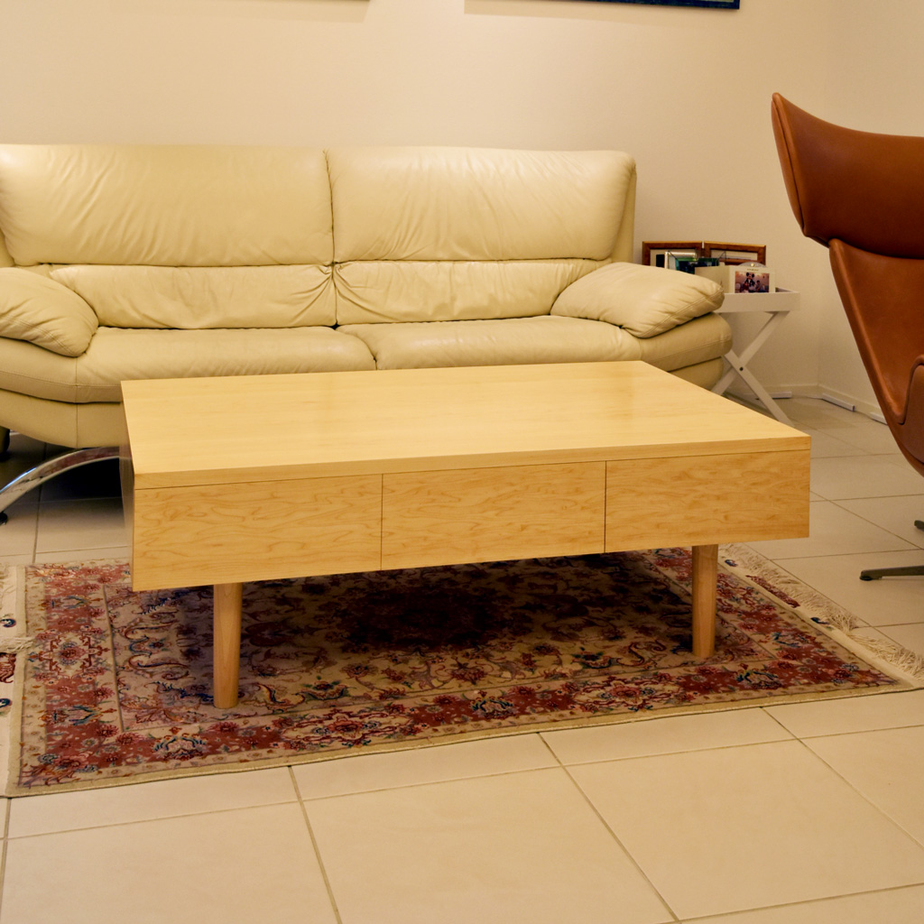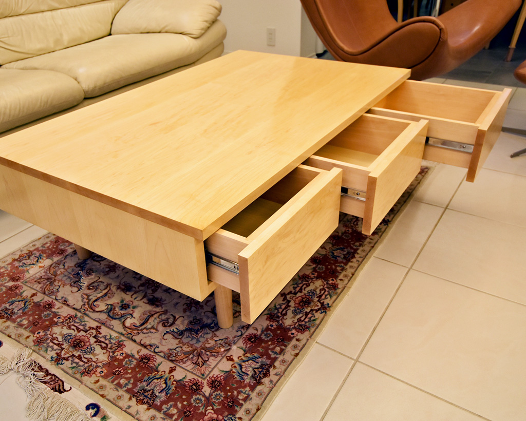 「機能的でかつ出来る限りシンプルなセンターテーブルを」と製作しました。外面は引き出しで、内側のソファー側はオープン棚になっています。シンプルだからこそ、木目の美しさを感じられるよう、材選びには力を尽くします。木目の目立たないメープルはあまり木目を気にせず作られることが多いのですが、色合いや木目を揃えると、それだけの結果を生み出せると思います。