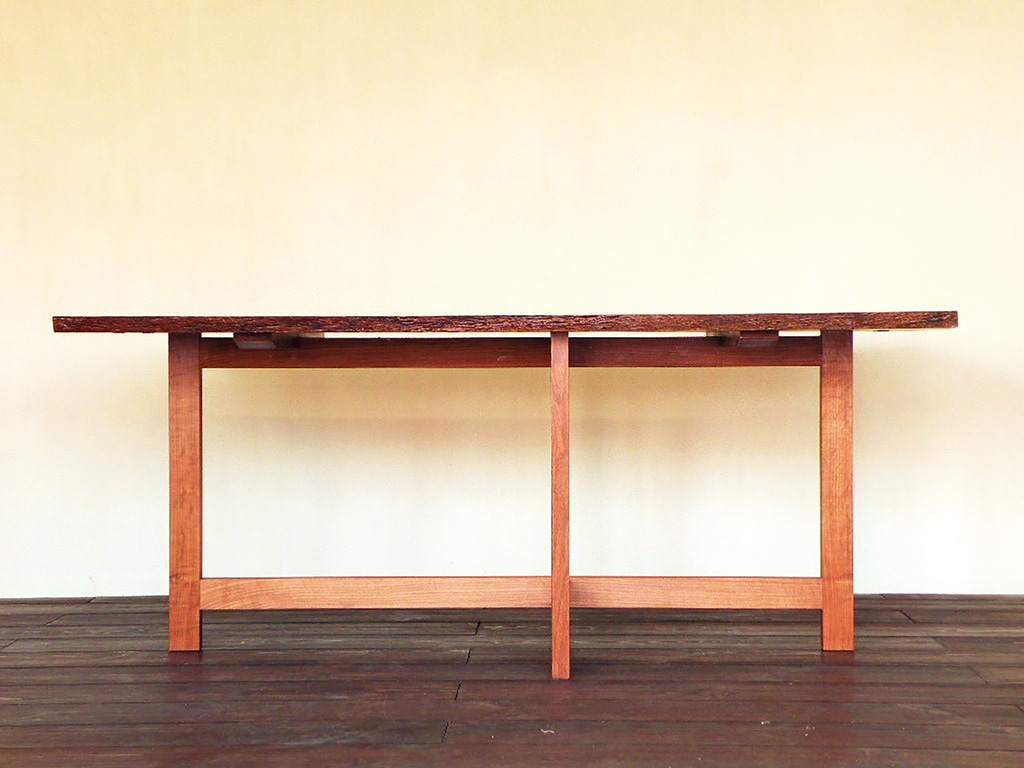 耳付き(樹皮付き)の天板は重厚な雰囲気のものが多いですが、現在の住居にも合うよう薄くすっきりと仕上げています。