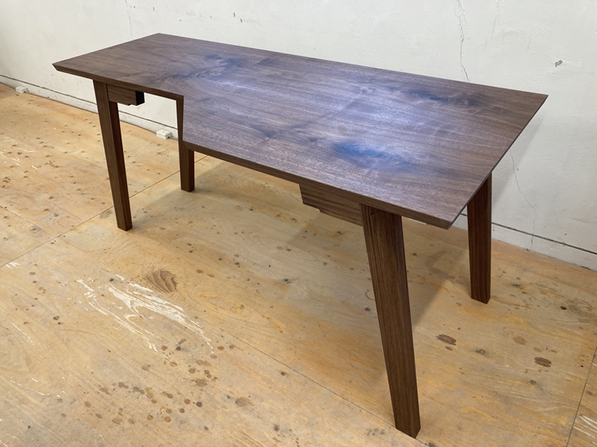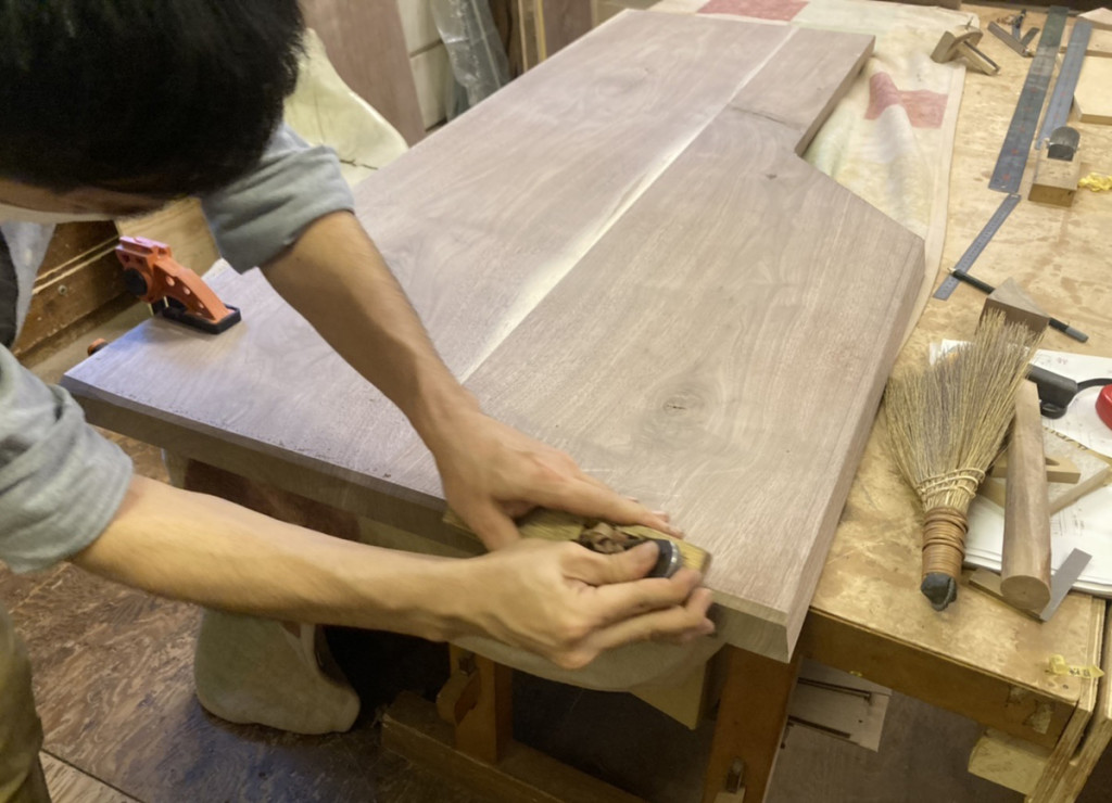 今回は脚の形状や面取りなど作り込みが多い意匠でまとめています。天板の面取りも板の厚みにあった見え方がするように、手加工で作業を進めていきます。機械加工だけでは作れない形がどうしてもあるため、時間は掛かりますが手鉋で丁寧に仕上げていきます。