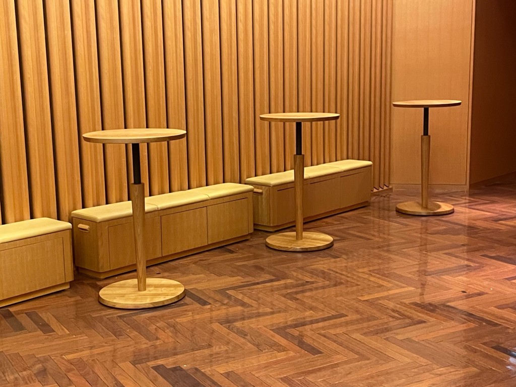 以前に納品実績のあるコンサートホール様から、今回はホワイエのテーブルの作り替え依頼をいただきました。
