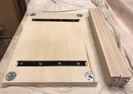 天板は2枚の材をハギ合わせています。幕板などを付けないかわりに、金属の反り止めを背面に埋込しました。