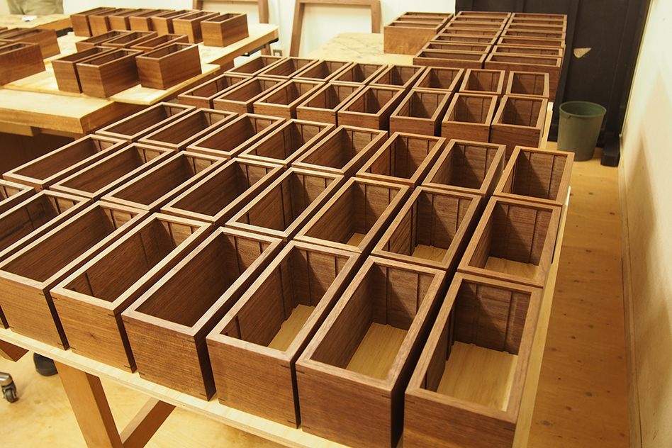 切り出した一枚の板を、天板、地板、側板と四つに切り分け、端を45°の角度でカットします。