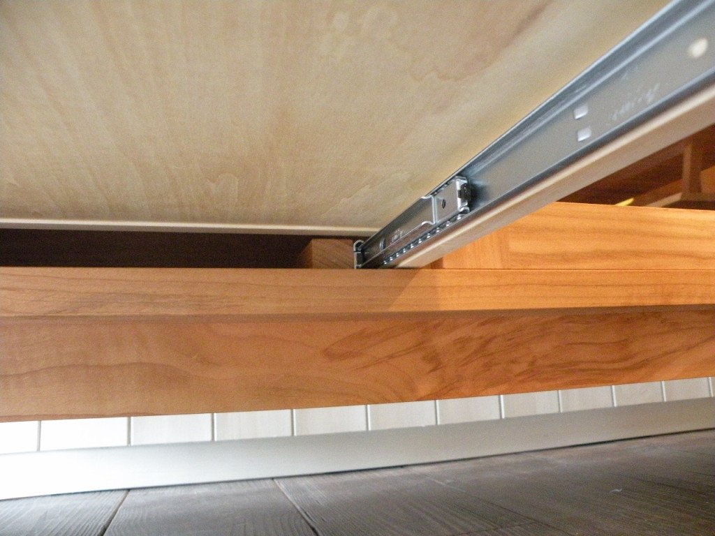 金物が目立たないようにとのご希望でしたので、レールの取り付け位置を工夫し、引き出しを開けてもスライドレール金物が見えないデザインにしました。