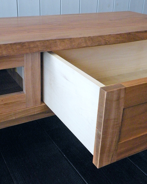 引き出しの箱には軽いシナの無垢材を使用しています。