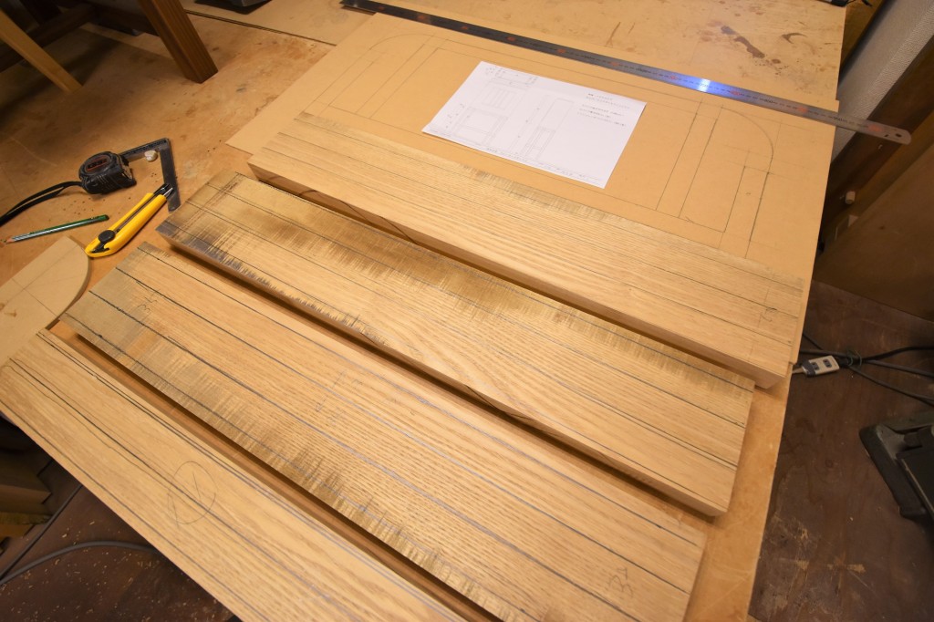 それぞれのパーツで木目が通るように、一本一本木取線を引いていきます。