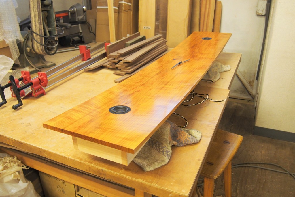 壁が白く、板を曲面に維持する強度が必要なため、同系色で硬さのあるメープルで制作します。