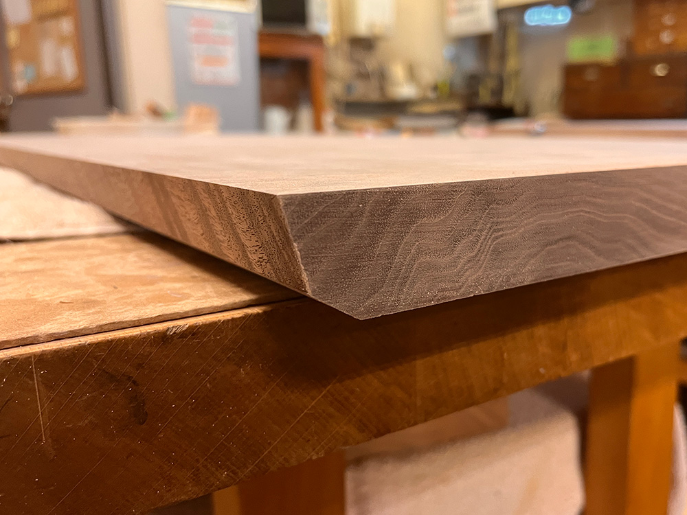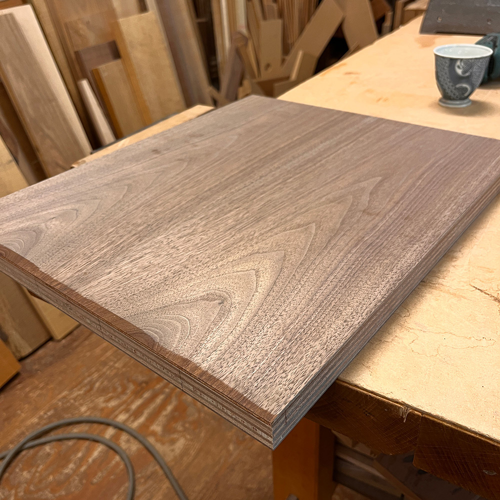 左の画像は本体の側板です。化粧合板の練り合わせですが、表に見える側板(外側)には2mmの無垢板を貼り付けました。通常の化粧合板の表面にも無垢が貼られていますが、その厚みはわずか0.3mmです。その厚み故に、本物っぽさが欠けて見えてしまうこともあります。しかし、2mmの厚みを持たせることで、表情に深みが出て、一見すると無垢一枚板のように見えてきます。