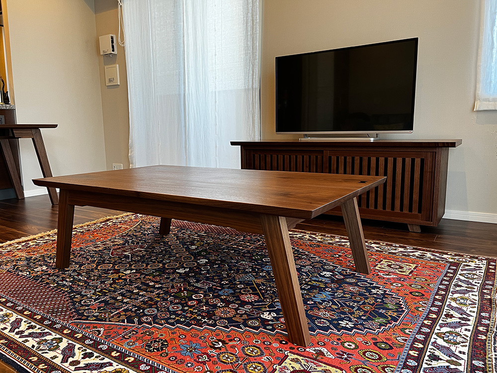 カウンターテーブル、コタツテーブル、テレビボード。それぞれにこだわりをお持ちのご依頼主様。一つ一つのご希望を叶えつつ、統一感を出すことができるのもオーダーメイドだからこそです。3つ並んだ空間に大変満足していただき、制作としても嬉しい限りです。