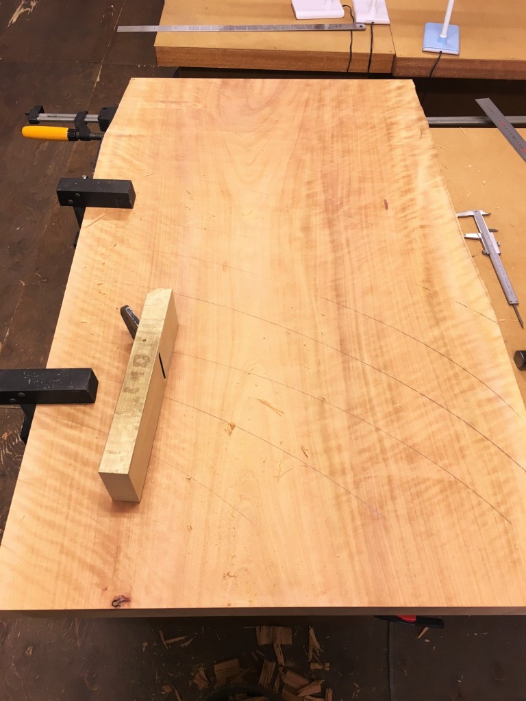 機械に通らない一枚板の平面出しは手加工での作業になります。