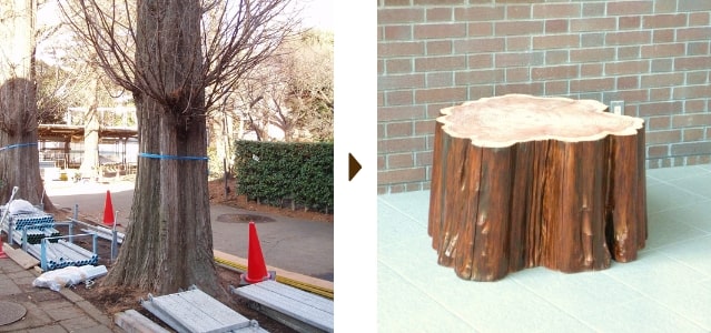 切り倒した大木を使った腰掛。校舎の建て替えのため、大きく育ったメタセコイア数本を切り倒すことに。「なんとか思い出として残したい」とのご依頼を受け、新校舎の正面玄関に置く腰掛としてリメイクすることを提案し、無事再生することができました。