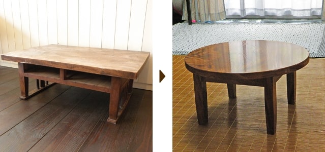 テーブルをお納めした際に、ご夫婦からあるご相談を受けました。100年以上前から代々使用してきたケヤキの文机。今や天板は曲がり、引き出しもなくなり、ベランダにひっそりと置かれていました。「丸い小さなローテーブルになりませんか?」とのご要望に答え、リメイクしました。「子供に受け継ぎたい」とのこと。これからまた100年以上使い続けられます。