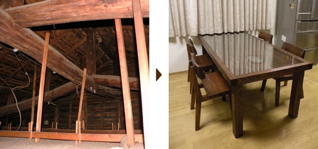 永く住み続けてきた木造住宅を建て直すことに。新居に使えなかった、お父さんが自慢していた梁をリメイクしたいと相談を受けました。壊す前の家を見て回ると、趣のある扉が目に止まり「いい扉ですね」とお伝えすると「家族の想い出が一番詰まっている扉なんです」と言われました。ダイニングテーブルセットにすることをご提案。扉をテーブルの鏡板とし、重厚な梁を最大限に活かしてリメイクしました。旧家の想い出をお母さんに遺してあげられました。
