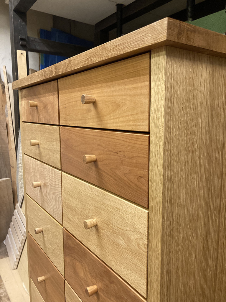 もともとはアウトセットの作りですが、引出しの前板が内に入るようにインセットの作りに替えています。