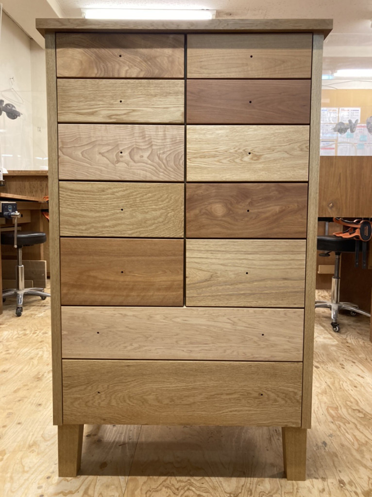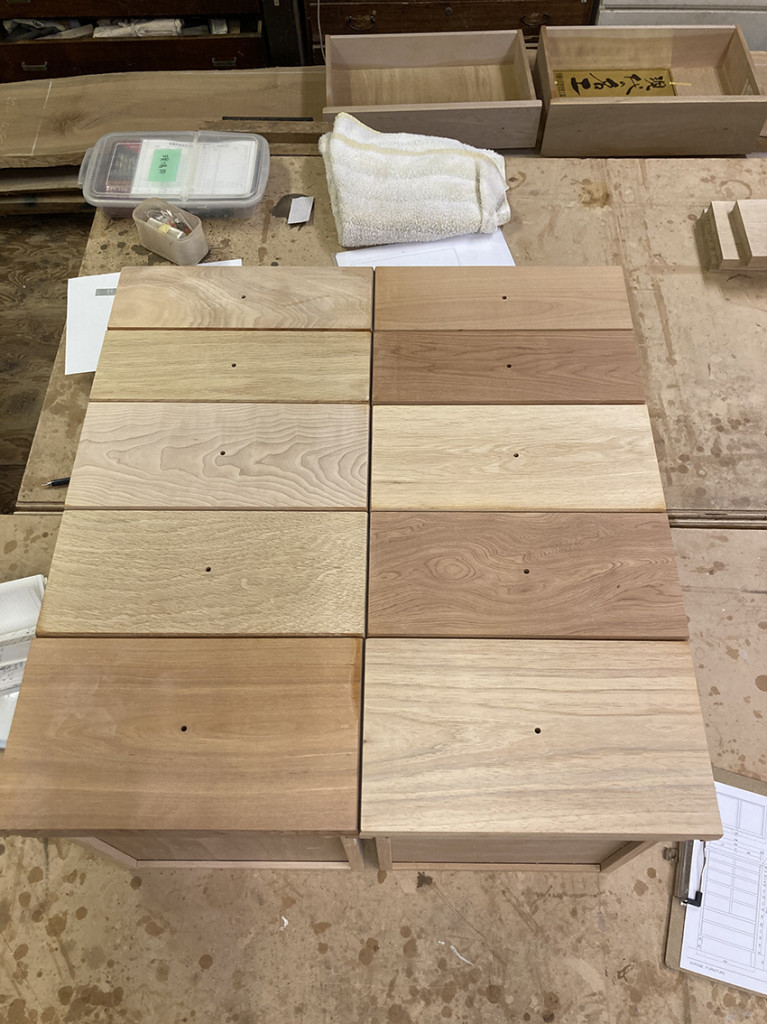 通常での箱物の制作では、始めに大きな外の箱を作り、そこに合わせるかたちで内部に収まる引出しを作ります。しかし今回のご依頼では既存の引出しに合わせて外の箱を作るという、通常とは逆の作り方をしていきました。