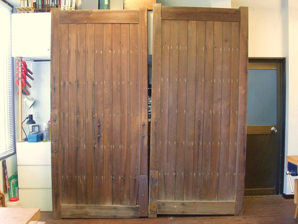 汚れた表面を丁寧に削り落し、2枚の扉のうち1枚を短くしてボルトで結合し、掘りのサイズに適した長さとします。幅方向は新たに松材を継ぎ足すことにしました。