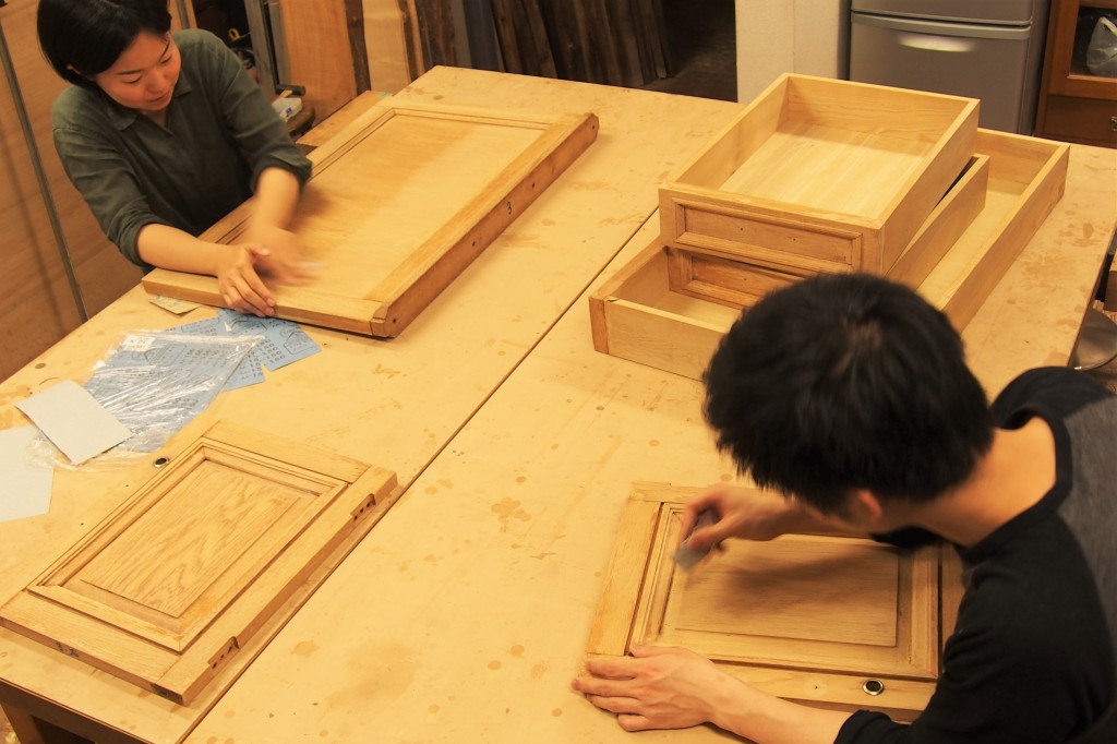 引き出しと扉の金具は新しいものに付け替えています。