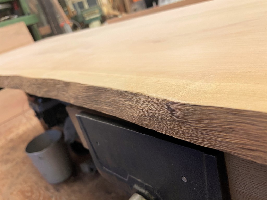耳付きの天板をご希望でしたので、耳を残す部分はグラインダーできれいに整えていきます。