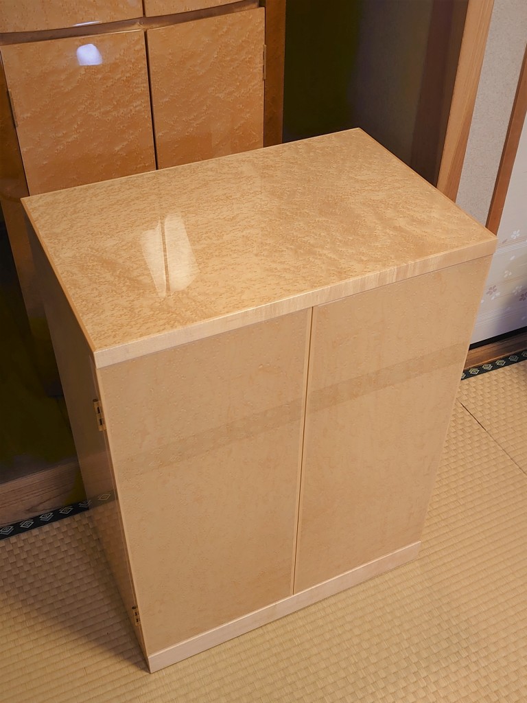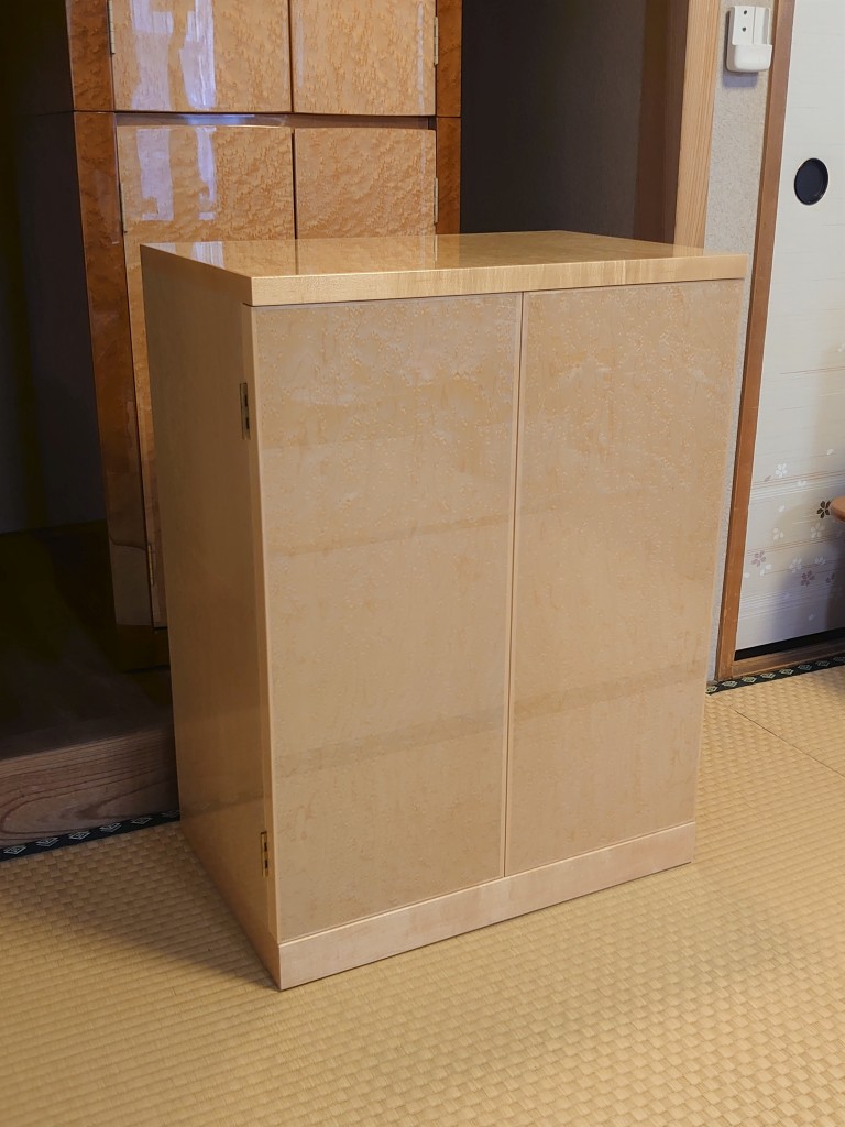 バーズアイメープルの仏壇をお持ちで、同素材を使った収納を探している中、弊社のホームページ掲載の納品事例に辿り着いたとのこと。
