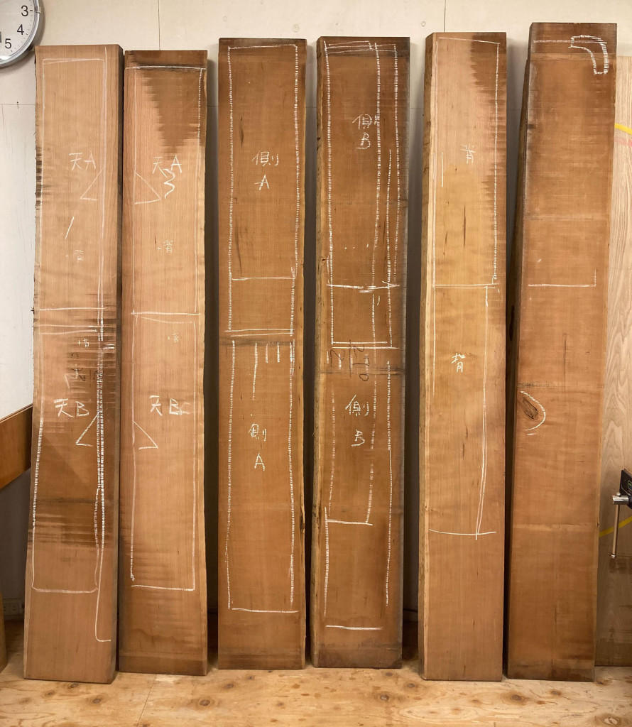 そのほかの部材についても、できるだけ木目が流れないように意識します。この木取りの過程が最終的な仕上がりに大きく関わってくるので、出来るだけ丁寧に行います。