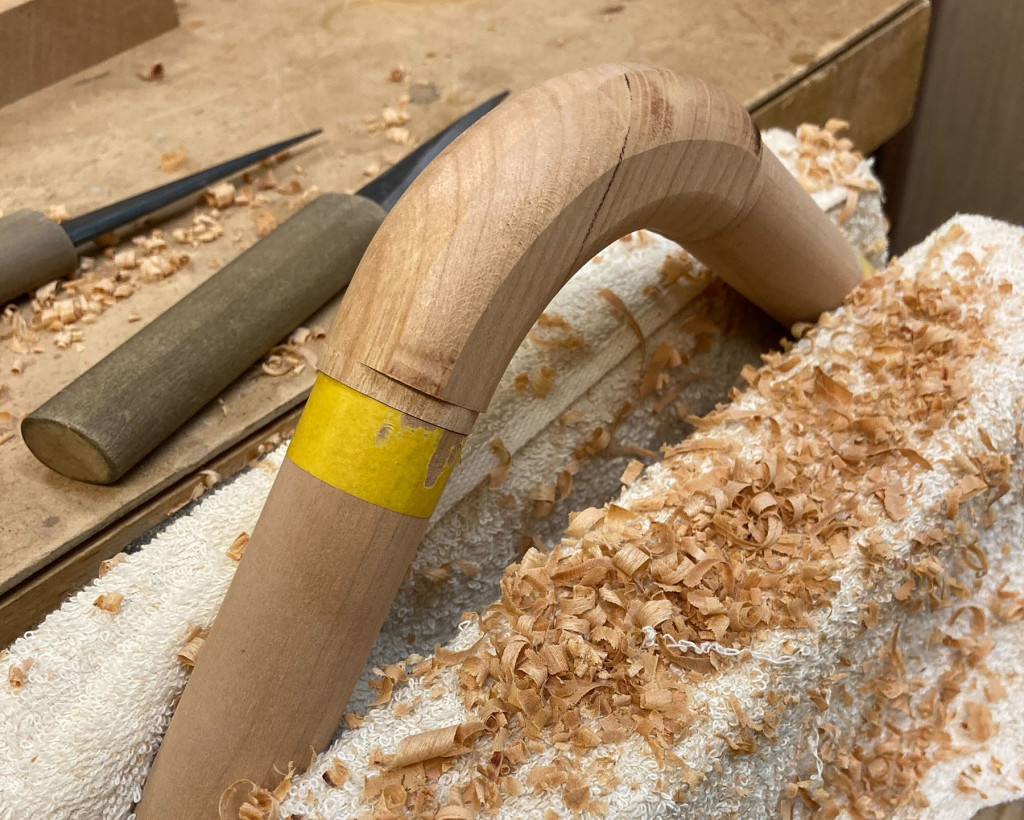円柱のフレームの曲線部分は、どうしても機械加工では作れないので手加工で削り出していきます。円の直径や曲線が狂わないように気を付けながら一つひとつ加工していきました。