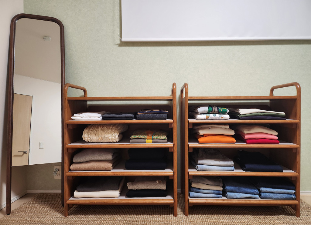 洋服を見せたいというご要望もあり、一般的な閉じた形の引き出し収納ではなく、フレーム材、天板と側板、つなぎ材と棚板での構成とし、全体的に軽やかな印象になるようにデザインしました。