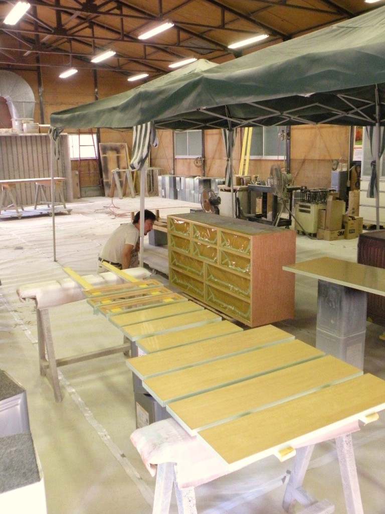 無垢がメインの家具工房としては珍しく、化粧合板を使用して制作することにしましたが、表面はバーズアイメープルという超高級な天然木の化粧合板を使用します。