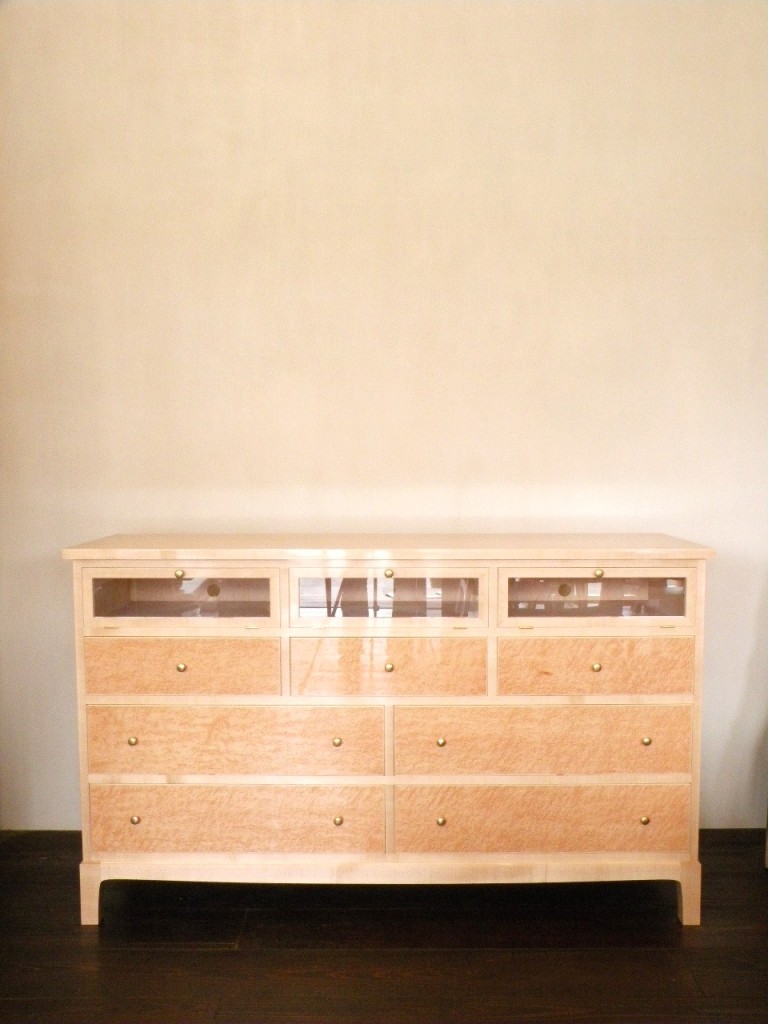 これだけのバーズアイが入ったメープルの無垢材を、このチェストが出来るくらい用意することは、まず不可能なので、こうしたものは化粧合板が適しています。