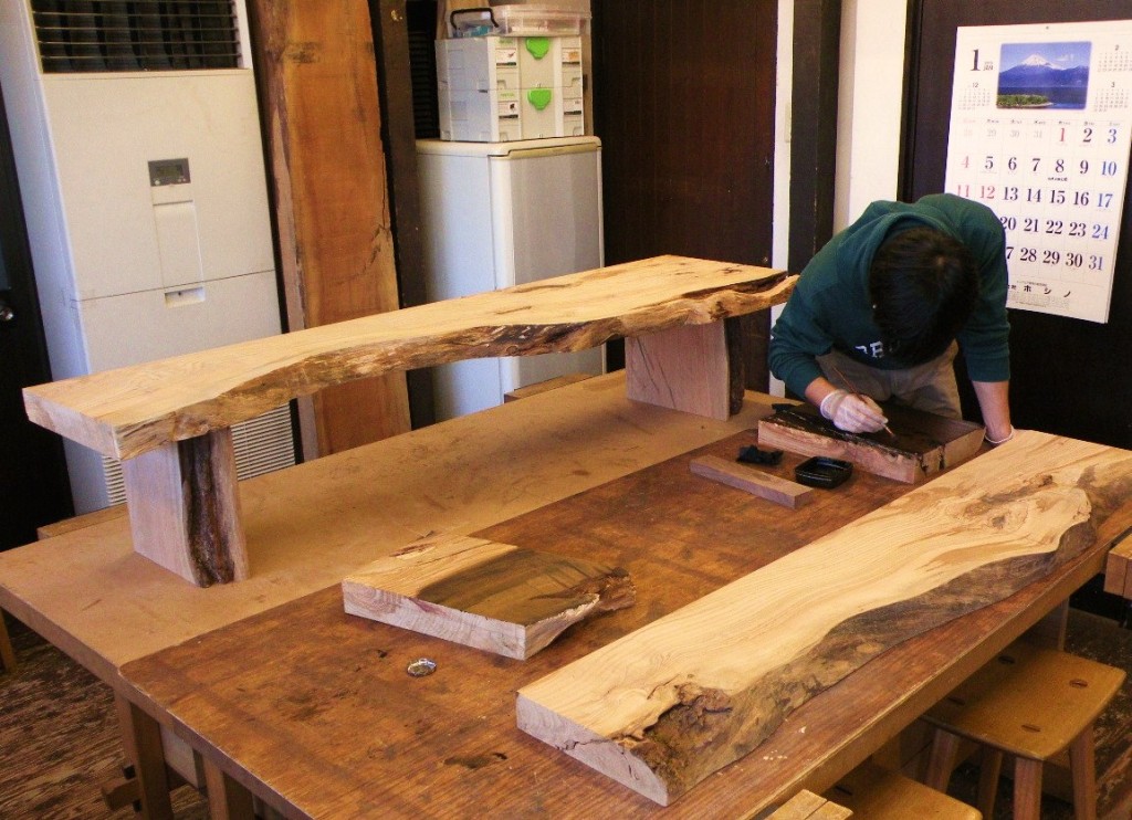 取り付けるお客様のご自宅に一枚板を持ち込み、カットする位置やサイズを一緒に決めました。