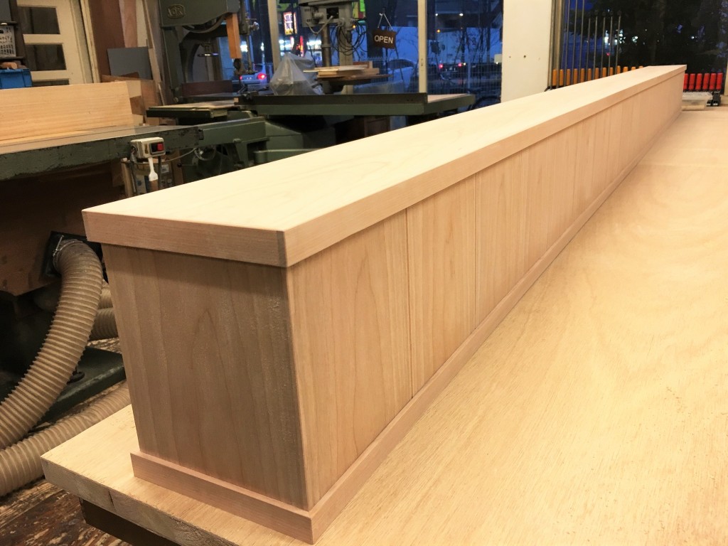 長さ3mの天板のため、合板の手配から練り付け(接着)、加工含め、一枚の板とはいえ容易ではありませんでした。