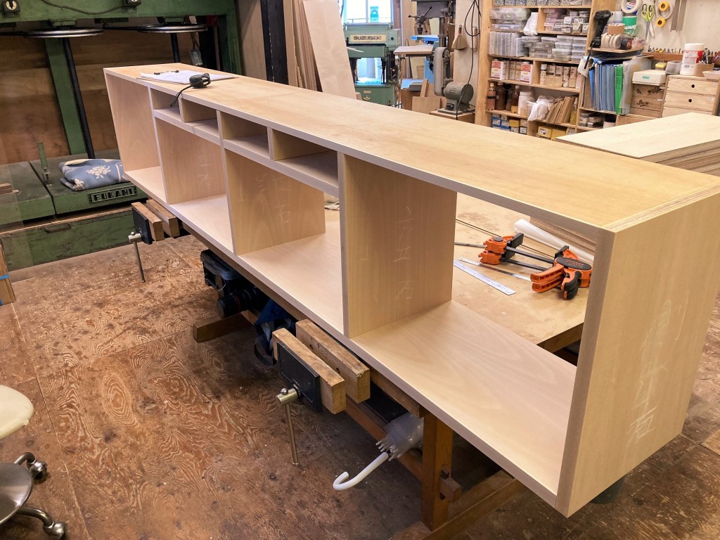 今回の抽斗は有効寸法を確保するためにスライドレールを使わず、仕込みによる収めにしました。加工時の湿気などを考慮しながら塩梅を調整します。