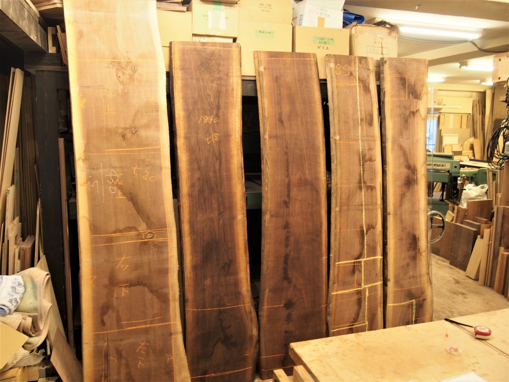 各棚板用の材も耳の形状含めて木取を検討していきます。