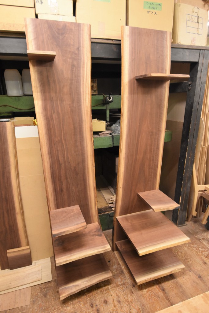 一枚板から各棚が立ち上がっているデザインの為、棚の強度を出すのに工夫が必要です。
