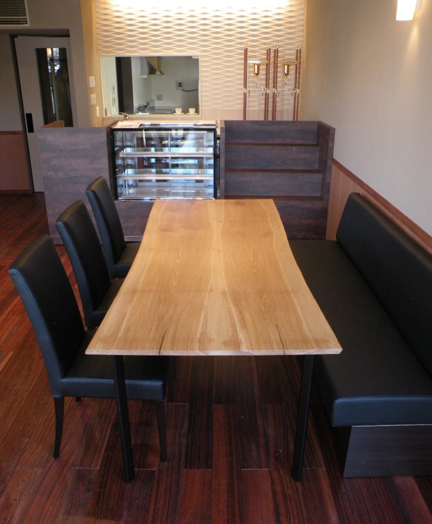 「入口前のテーブルだけは、無垢材の天板で見せたい」とのことで、テーブルひとつだけをお納めしました。